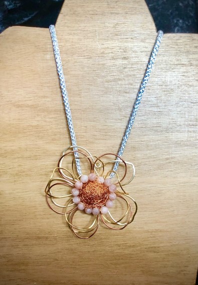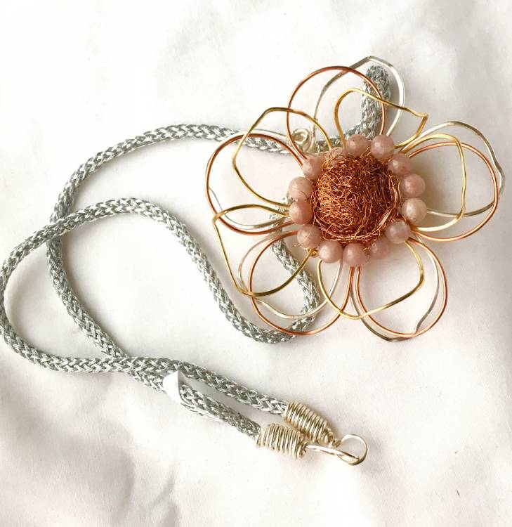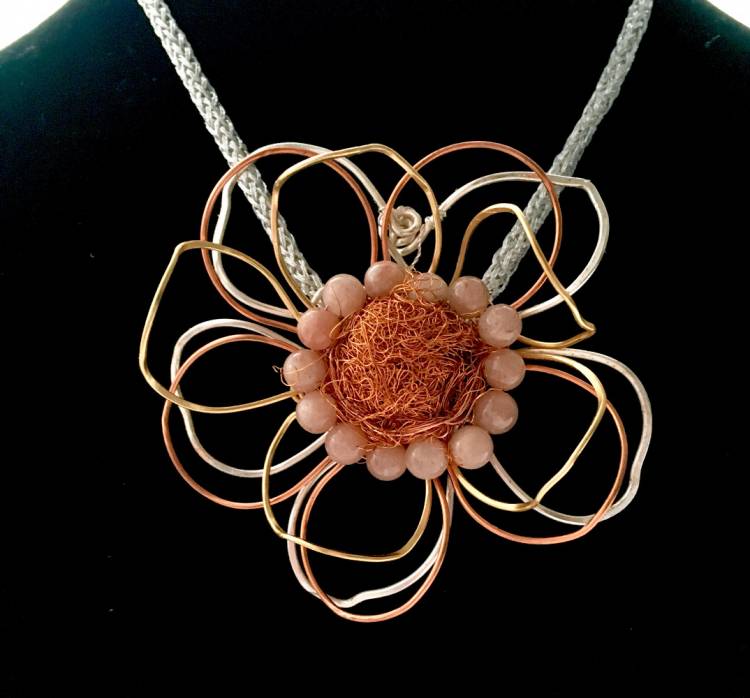 Copper Gilt and Silver Wire Flower Necklace with Peach Moonstone