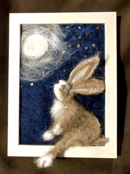Moon Gazing Hare Felted Picture in a 15x13cm frame, which can be free-standing or hung