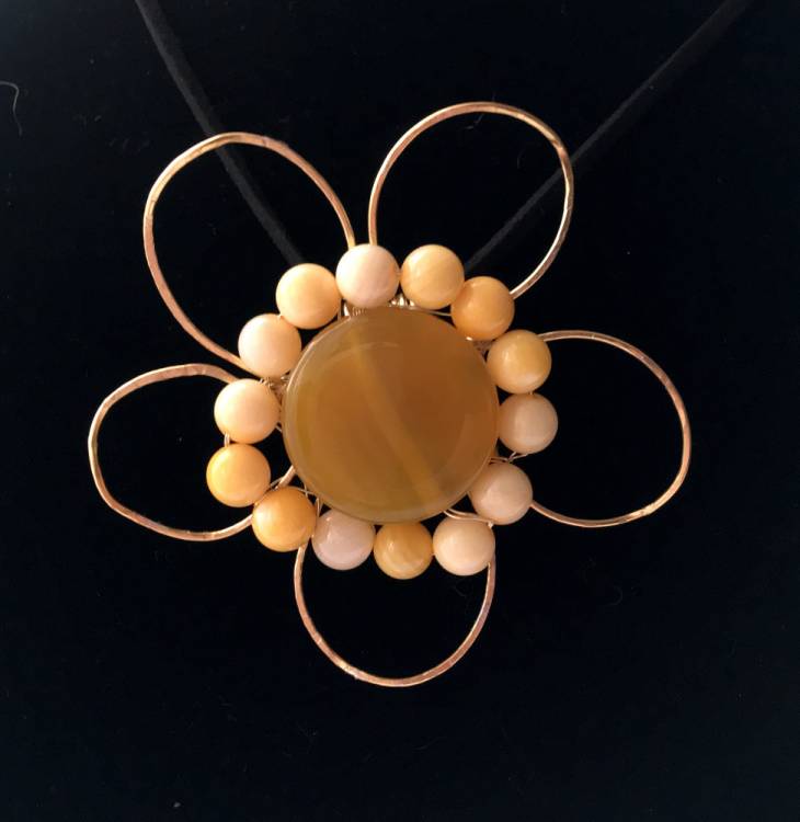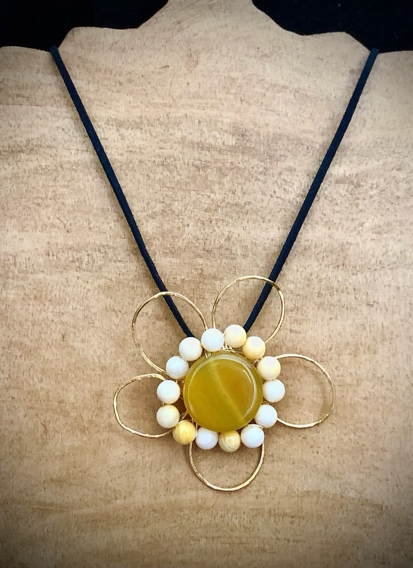 Gold Wire Flower Necklace with Yellow Agate Disc and Lemon Aragonite Balls on 45cm Black Suede Chord