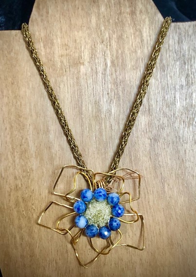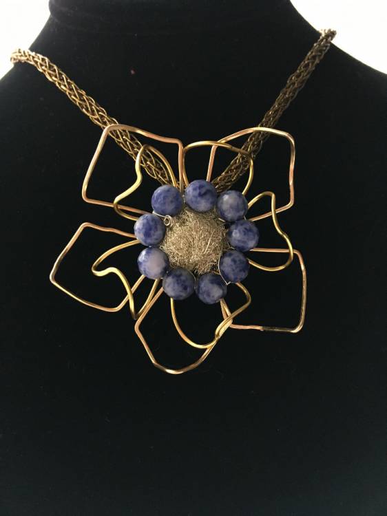 Gold Wire Flower Necklace with Sodalite Balls on Antique Gold Sari Rope approximately 45cm