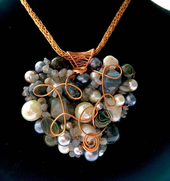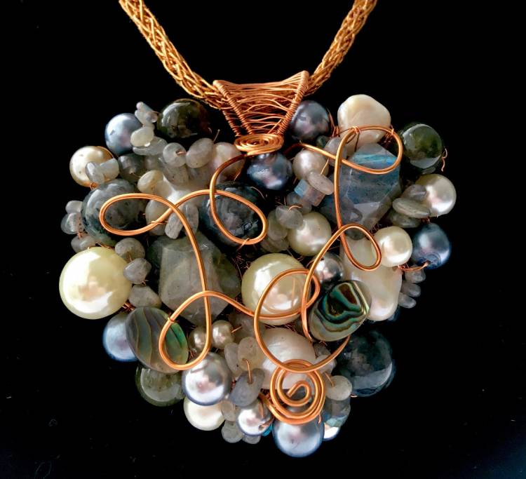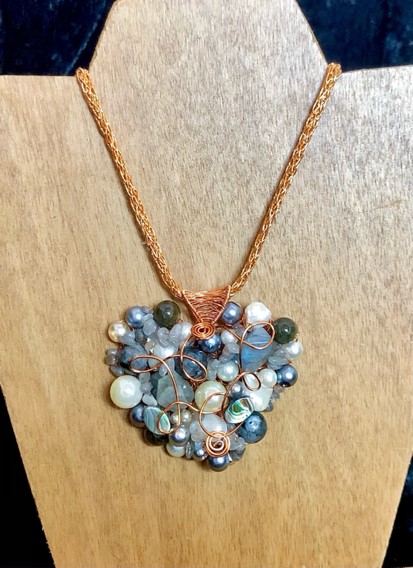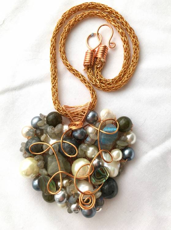 Heart Pendant Necklace with different cuts of Labradorite, Pearls, Shell Pearl and Abalone on Copper Sari Rope approximately 45cm