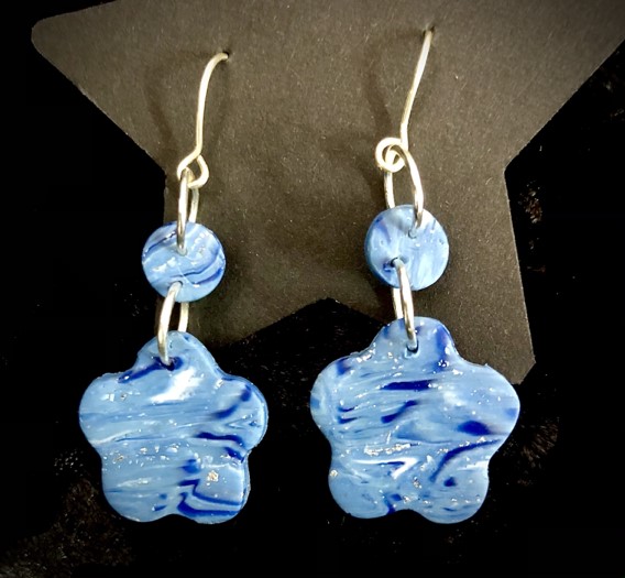 Mottled Blue, White and Silver Flower Polymer Clay Earrings